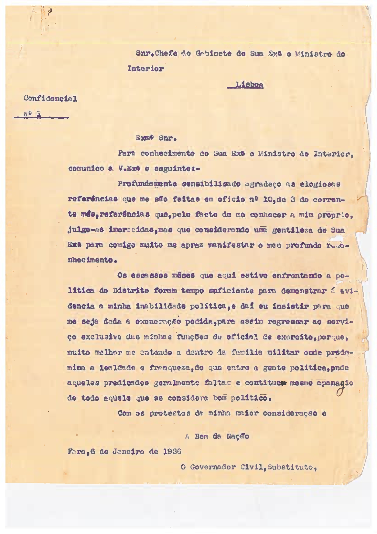 O Governador Civil de Faro pede a exoneração do cargo por “inabilidade política” e pretende regressar às funções de oficial de exército, porque se entende melhor “dentro da família militar onde predomina a lealdade e a franqueza, do que entre a gente política, onde aqueles predicados geralmente faltam e constituem mesmo apanágio de todo aquele que se considera bom político”.